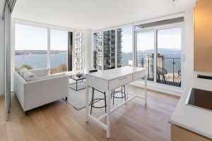 Welcome to luxury waterfront living at its finest! This stunning 2-bedroom, 2-bathroom 2 Flex room 1 Laundry room and a wrap around balcony unit is the epitome of modern elegance, offering a spacious and stylish sanctuary with breathtaking views. Spanning approx 1200 sq. ft. and facing the west and also north, this unit boasts panoramic waterfront views of English Bay and the picturesque entrance of Stanley Park. Step inside and be greeted by the perfect blend of comfort and convenience. The suite features in-suite washer and dryer, ensuring hassle-free laundry days. The well-appointed kitchen comes equipped with a dishwasher, making meal cleanup a breeze. Each bedroom is complemented by its own ensuite bathroom, offering privacy and convenience for couples, young professionals, students, and retirees alike. Indulge in the luxury of individual thermostats ( heat and air cooling system), allowing you to create your own ideal climate year-round. Imagine waking up to the soothing sounds of the water and enjoying your morning coffee on your “wrap around” balcony, taking in the stunning views that surround you. Whether you’re looking for a tranquil retreat or a place to entertain, this unit has it all. Immerse yourself in the vibrant energy of the city while enjoying the serenity of waterfront living. Dining, shopping, groceries, wine, drug store, nail salon….all within a 1 block radius. Don’t miss the opportunity to experience this remarkable lifestyle firsthand – book a tour today and secure your dream apartment.