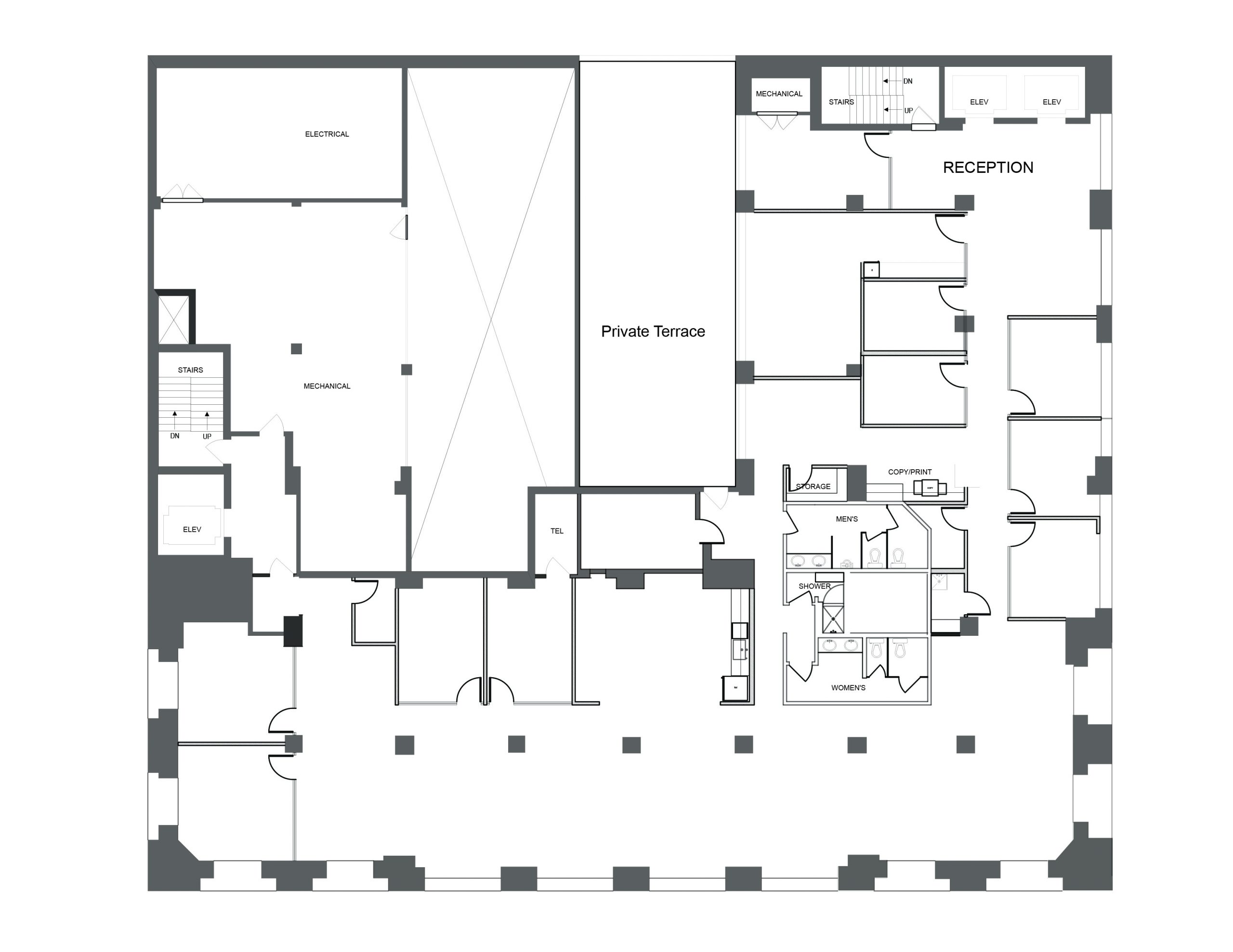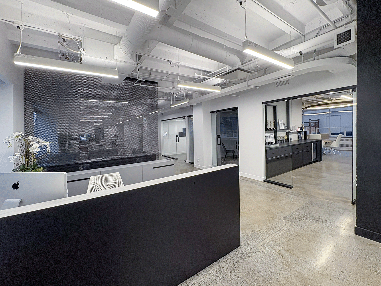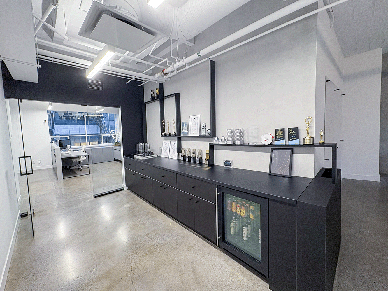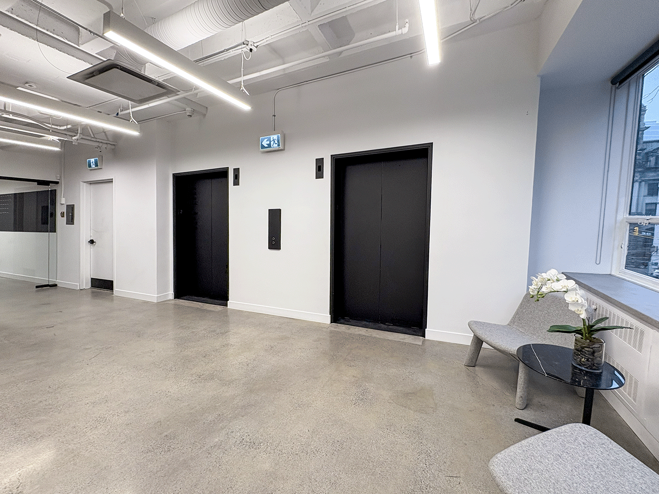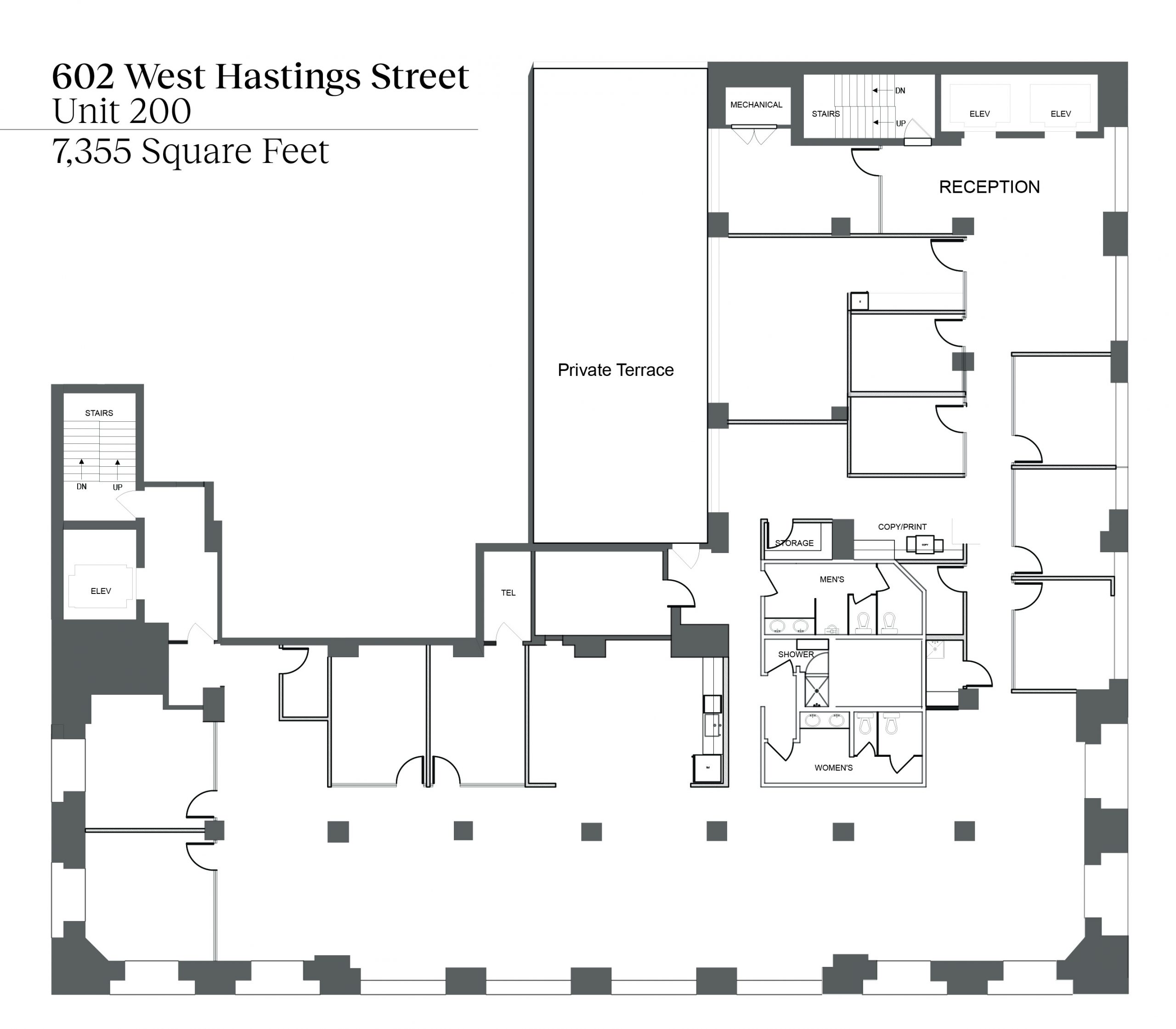 Unit #200 offers 7,355 SF of fully upgraded office space featuring matte black finishes, floor-to-ceiling glazing, polished concrete floors, and exclusive access to an expansive private outdoor terrace.
