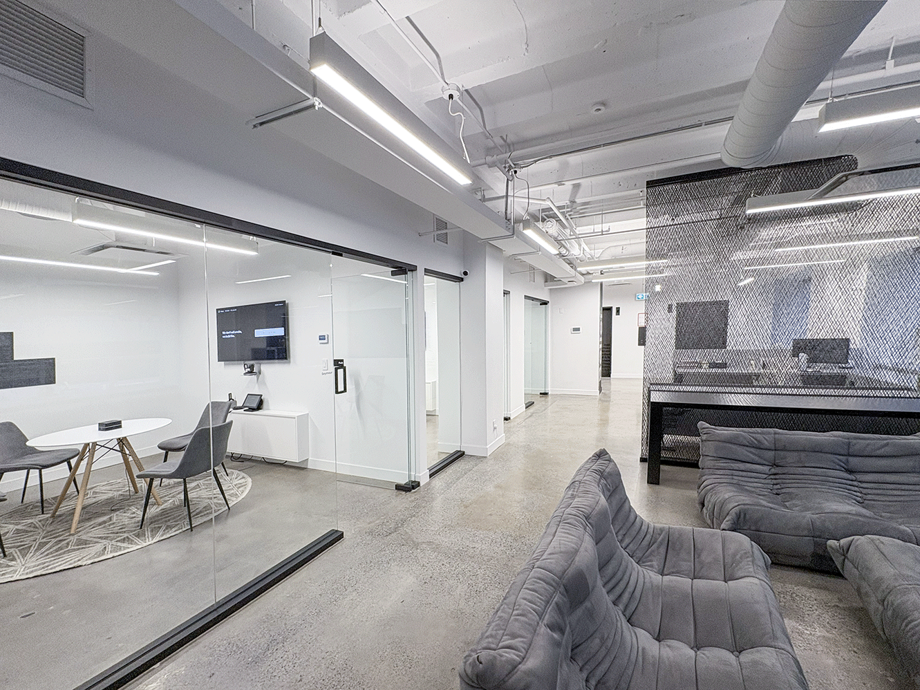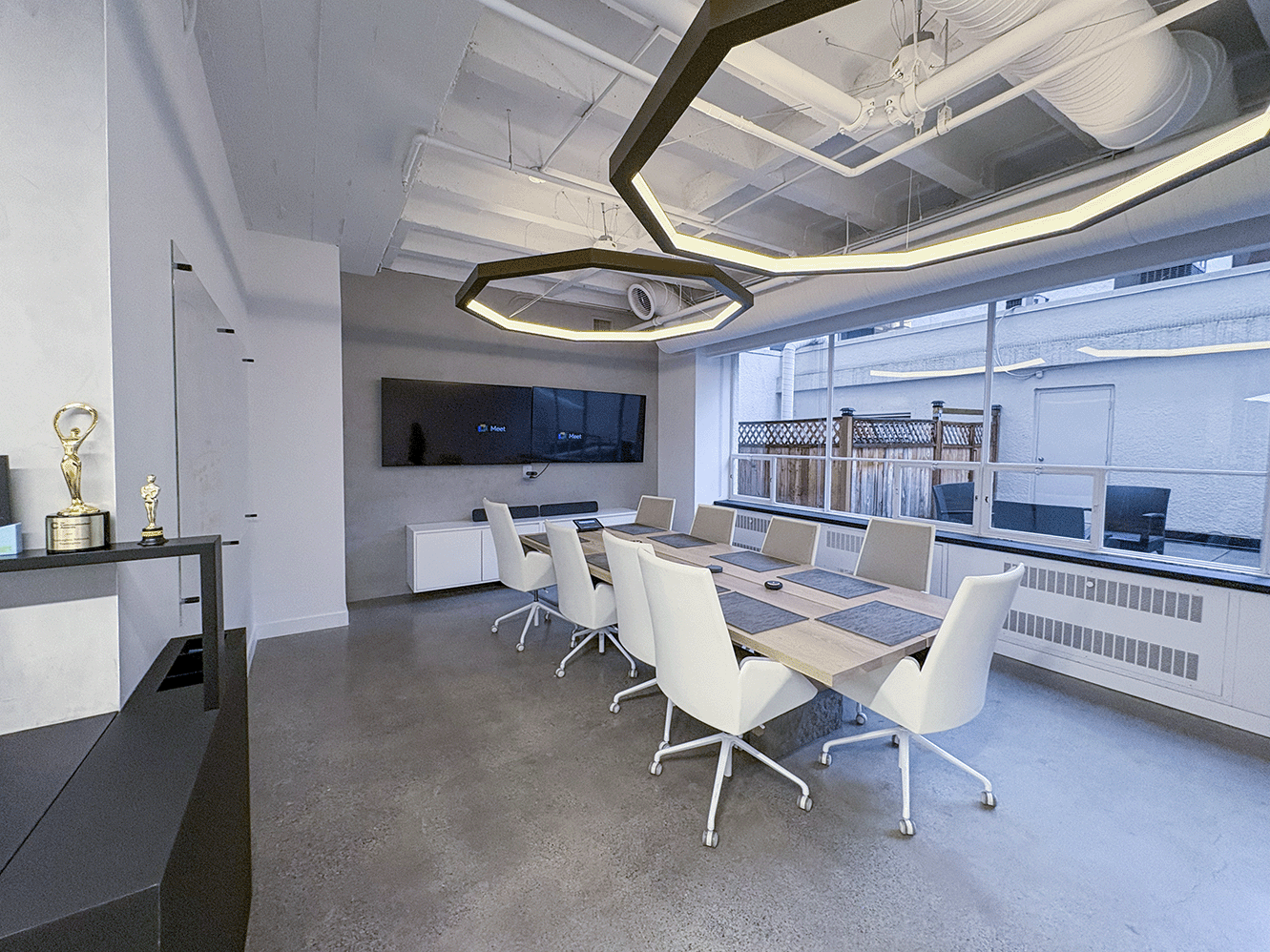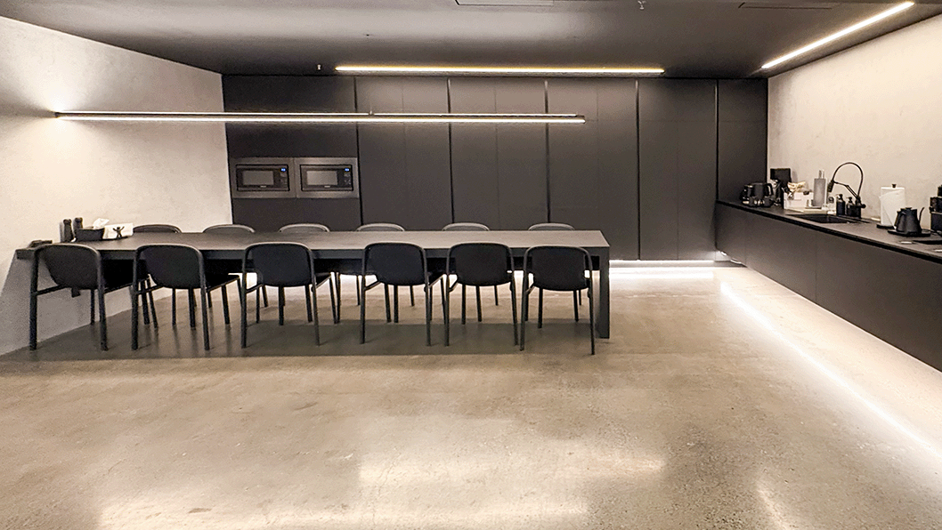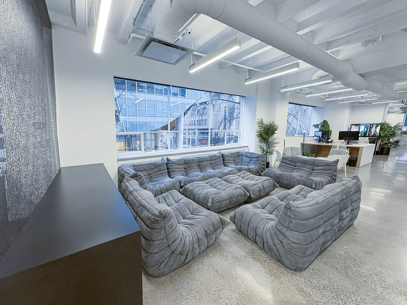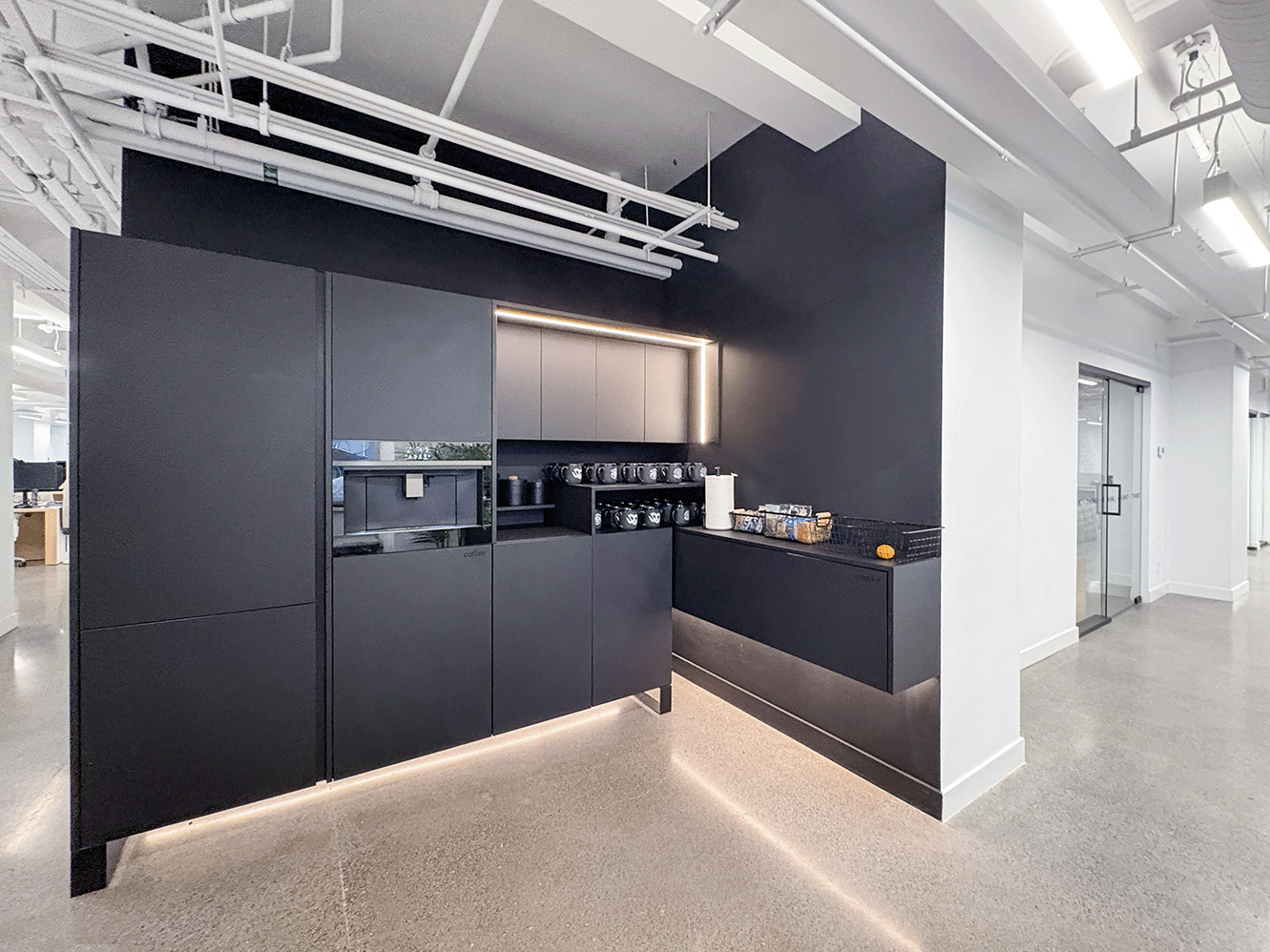 Unit #200 offers 7,355 SF of fully upgraded office space featuring matte black finishes, floor-to-ceiling glazing, polished concrete floors, and exclusive access to an expansive private outdoor terrace.