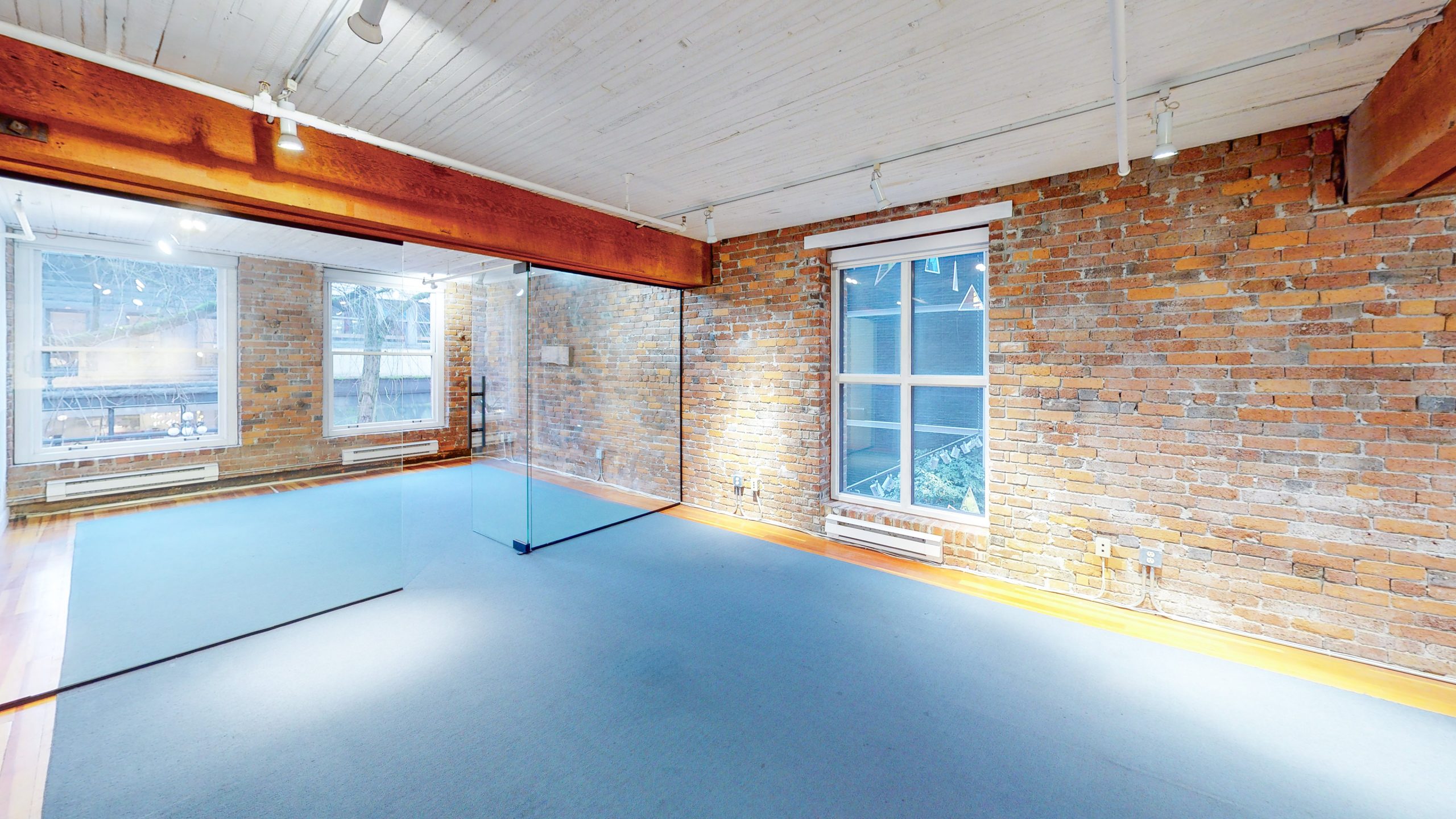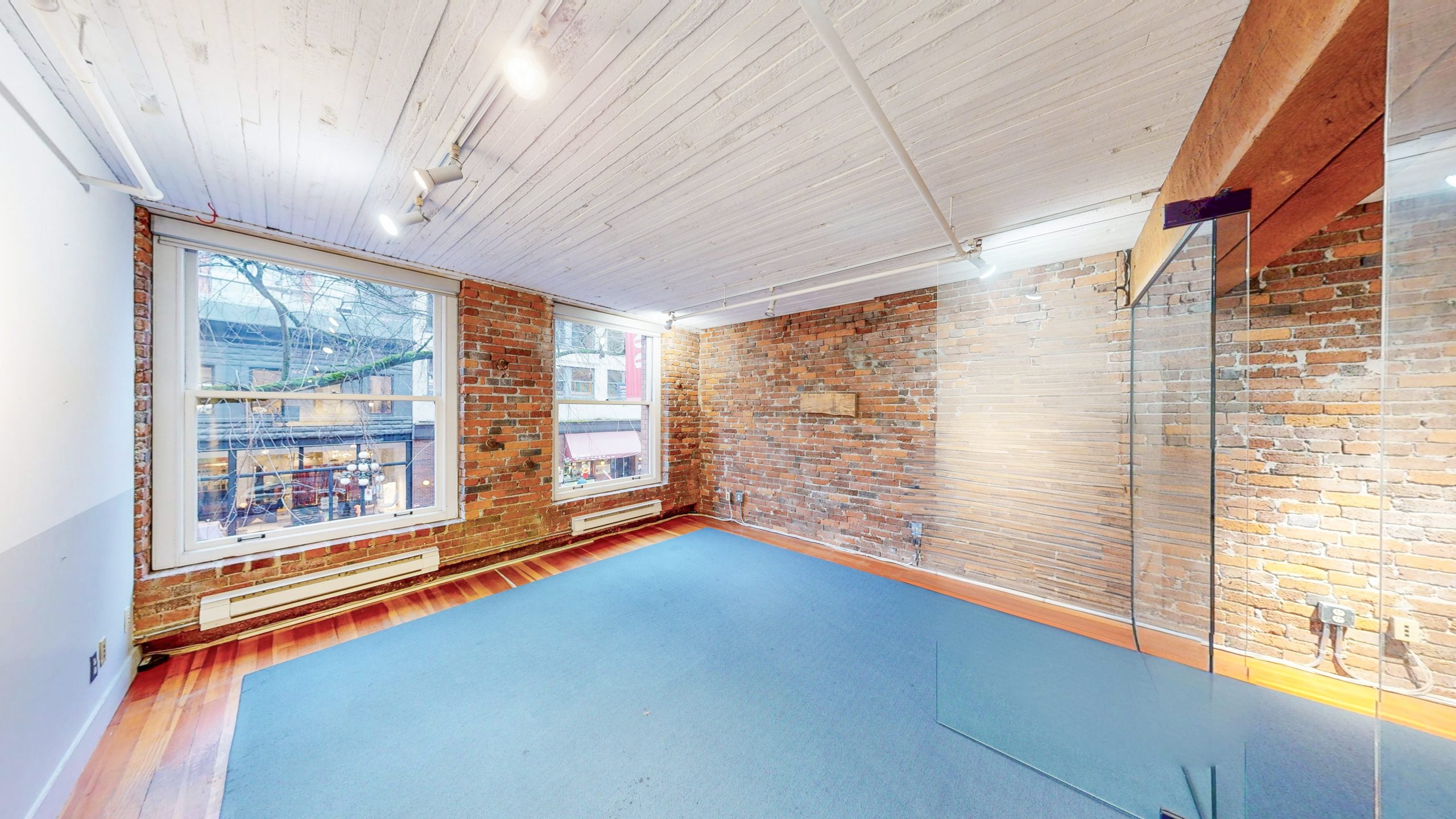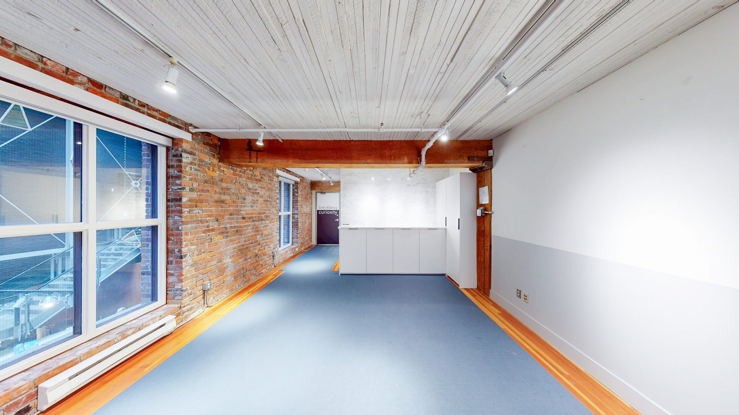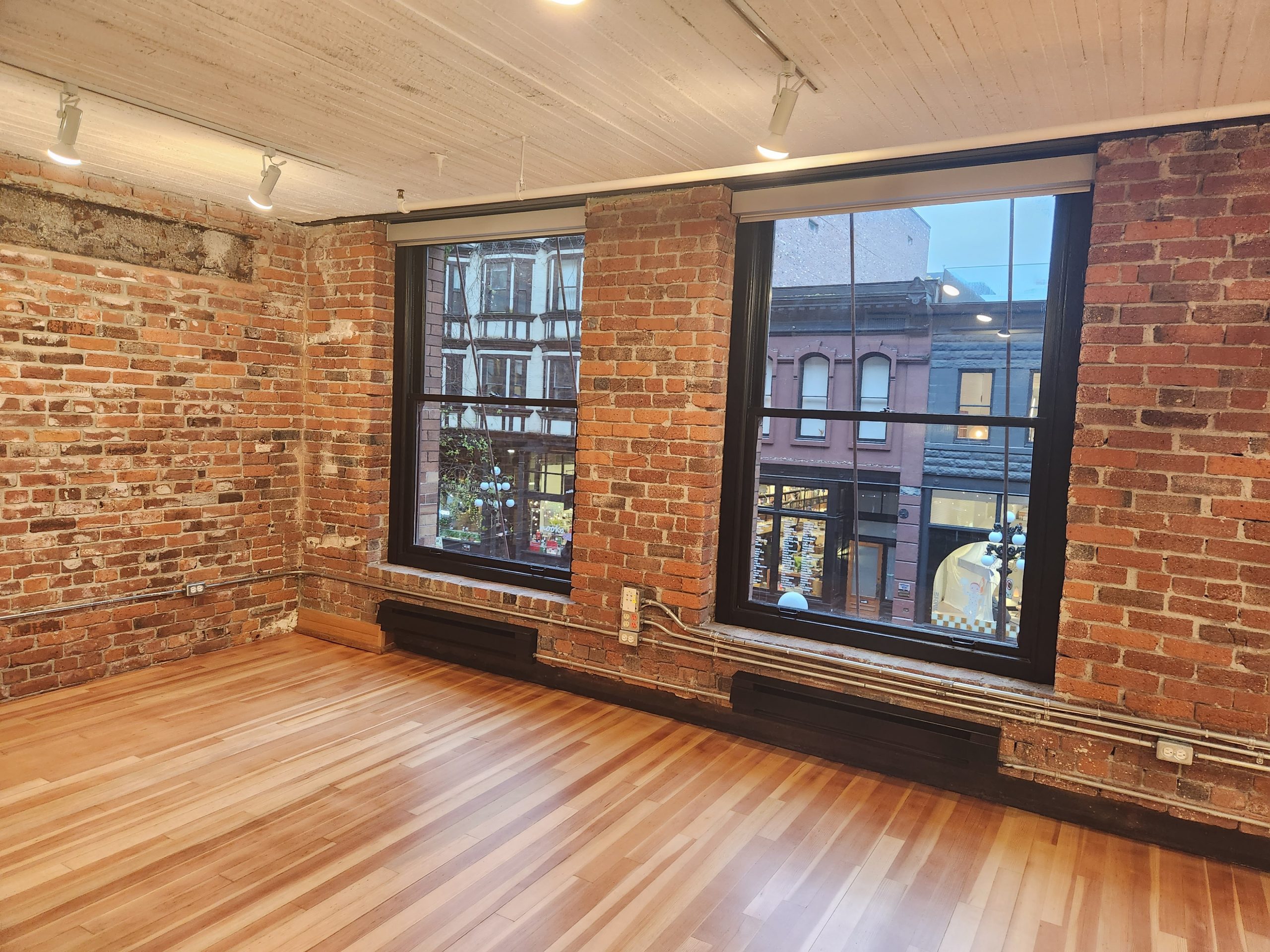 Corner heritage suite with exposed brick, timber beams, and abundant natural light with views of Downtown Vancouver.