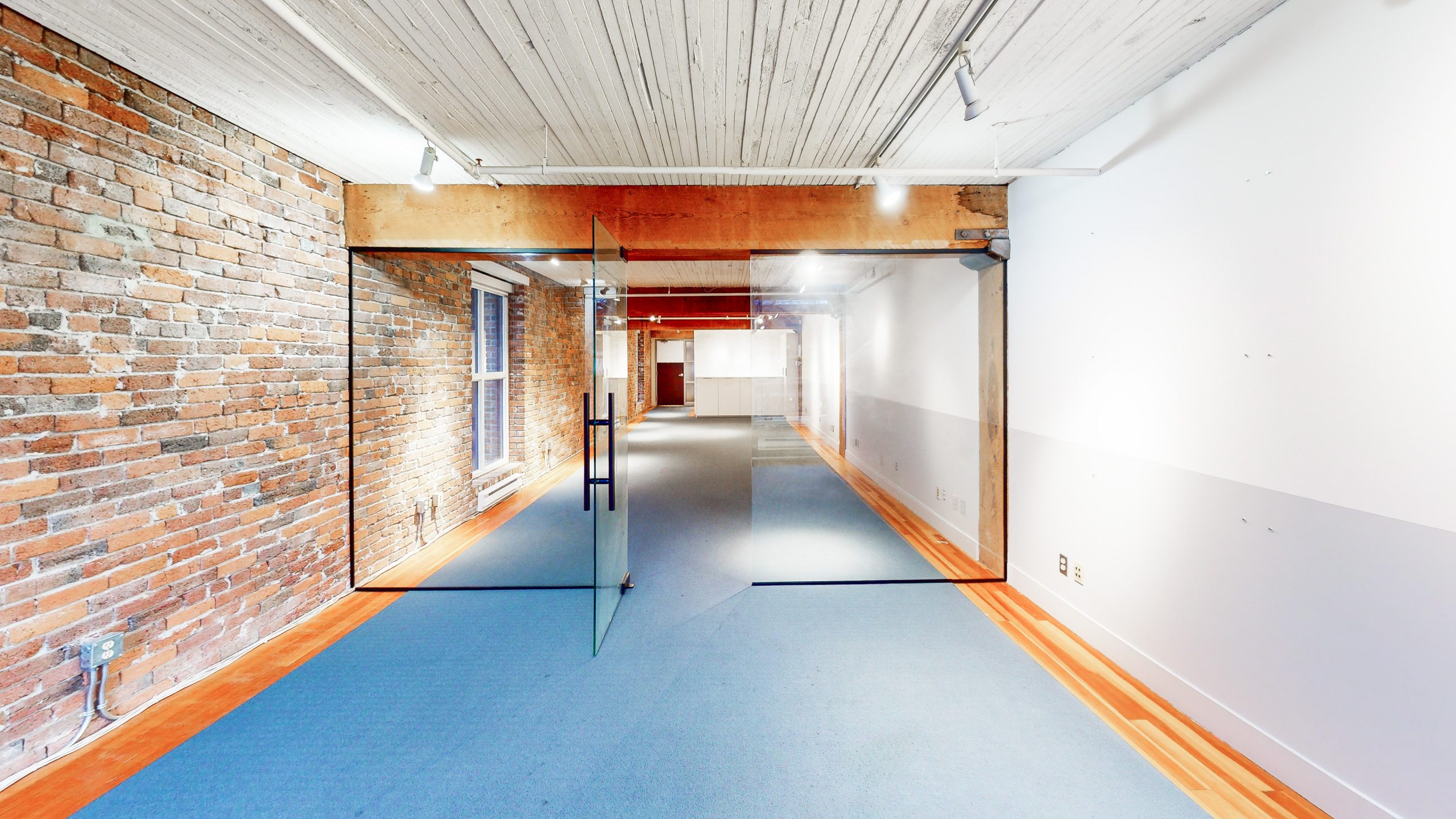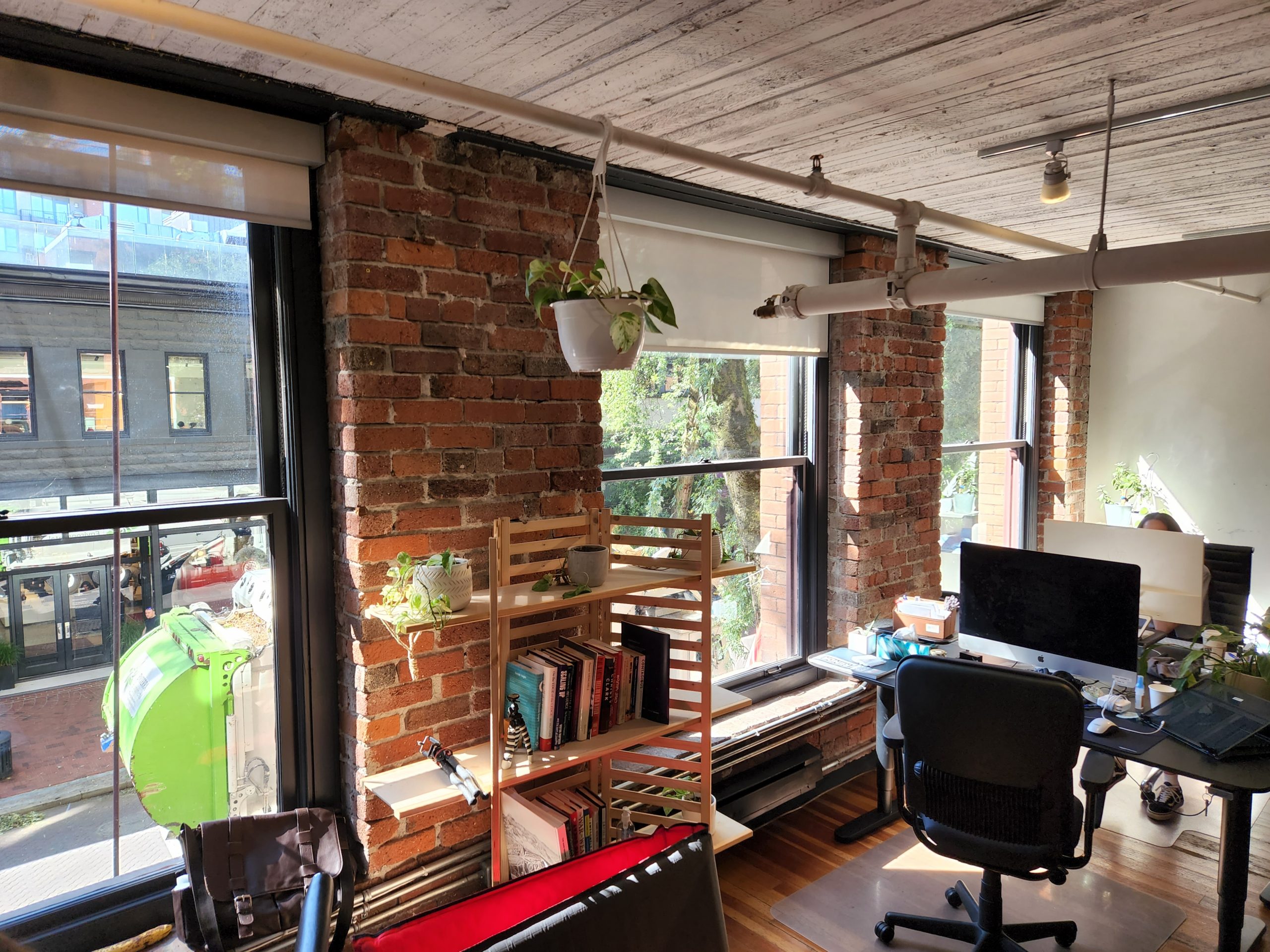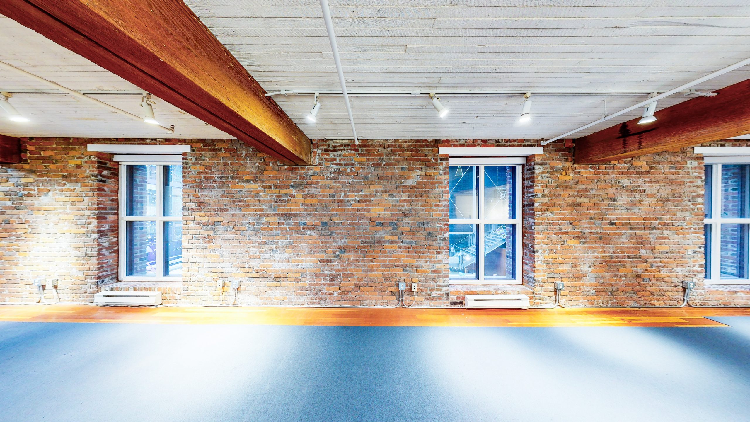 Corner heritage suite with exposed brick, timber beams, and abundant natural light with views of Downtown Vancouver.