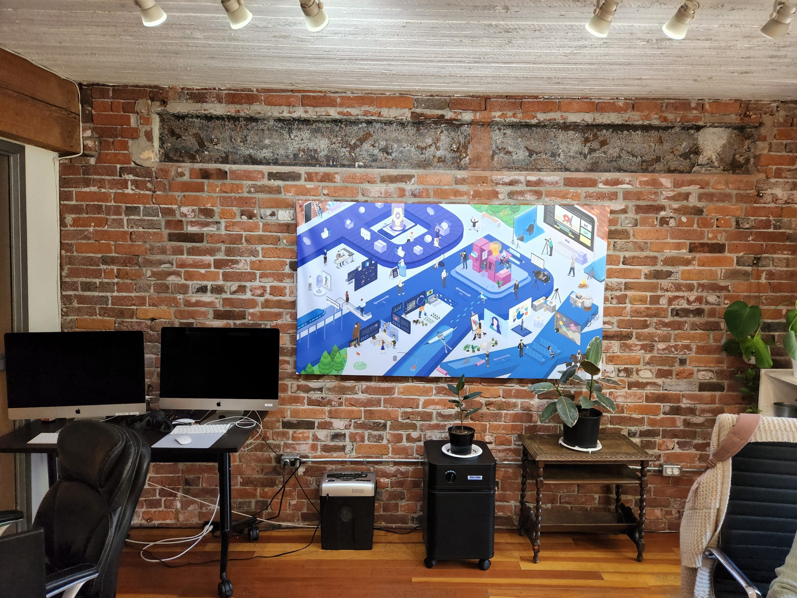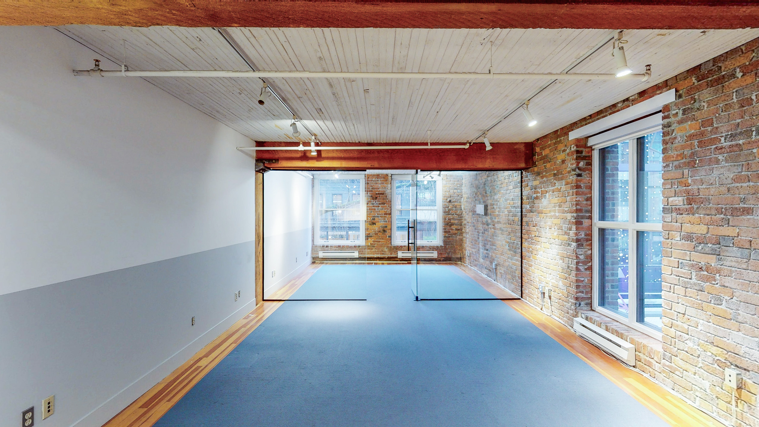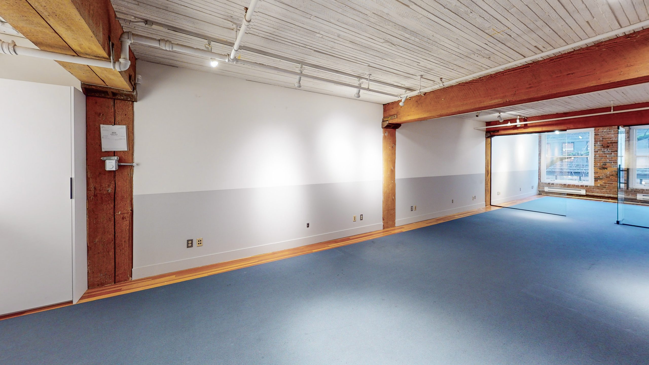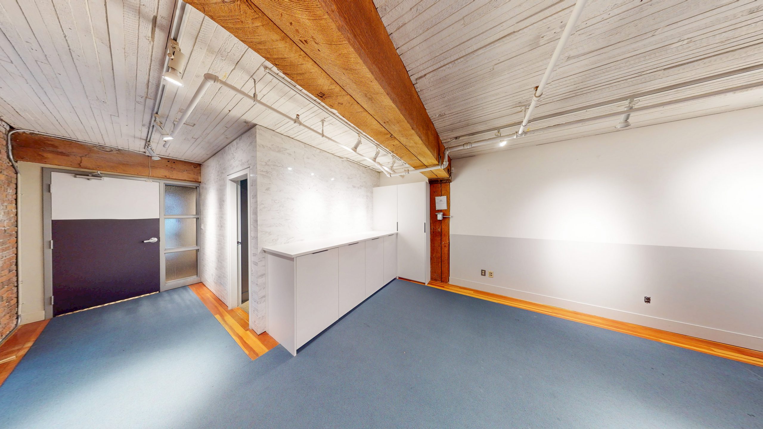 Corner heritage suite with exposed brick, timber beams, and abundant natural light with views of Downtown Vancouver.