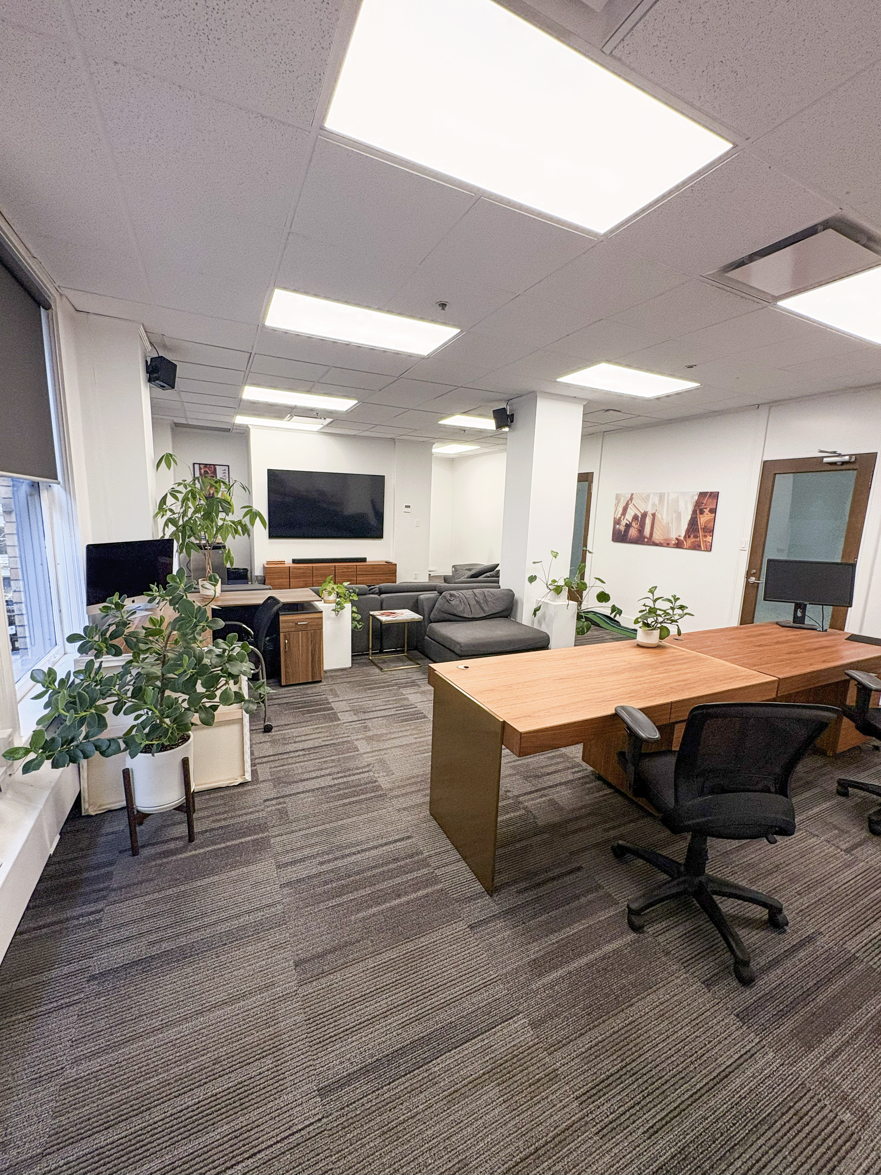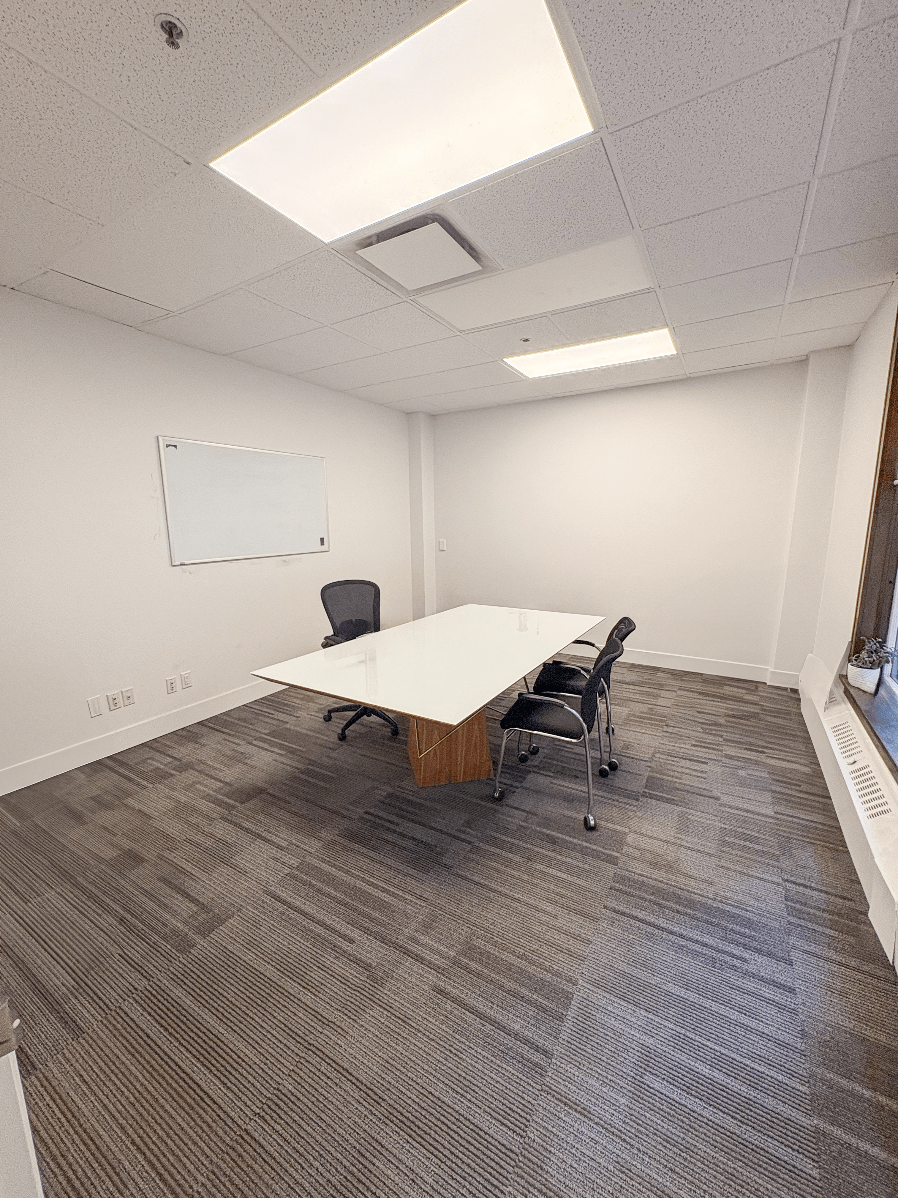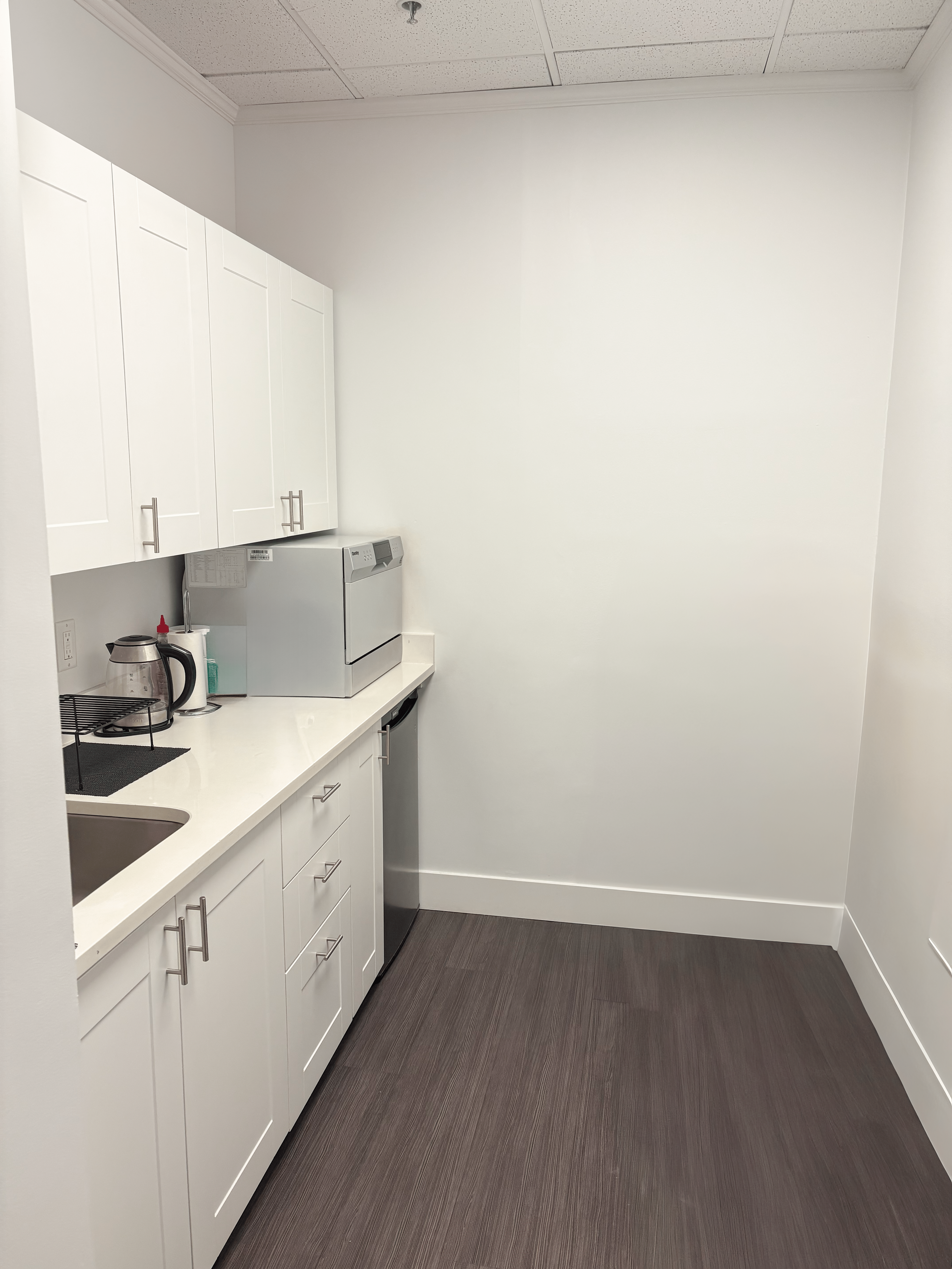 Suite 218 features open layout with one boardroom and an open plan work area totaling 1,226 SF. Equipped with a functional kitchenette area featuring quartz counter tops, spacious cabinets, sink and refrigerator.