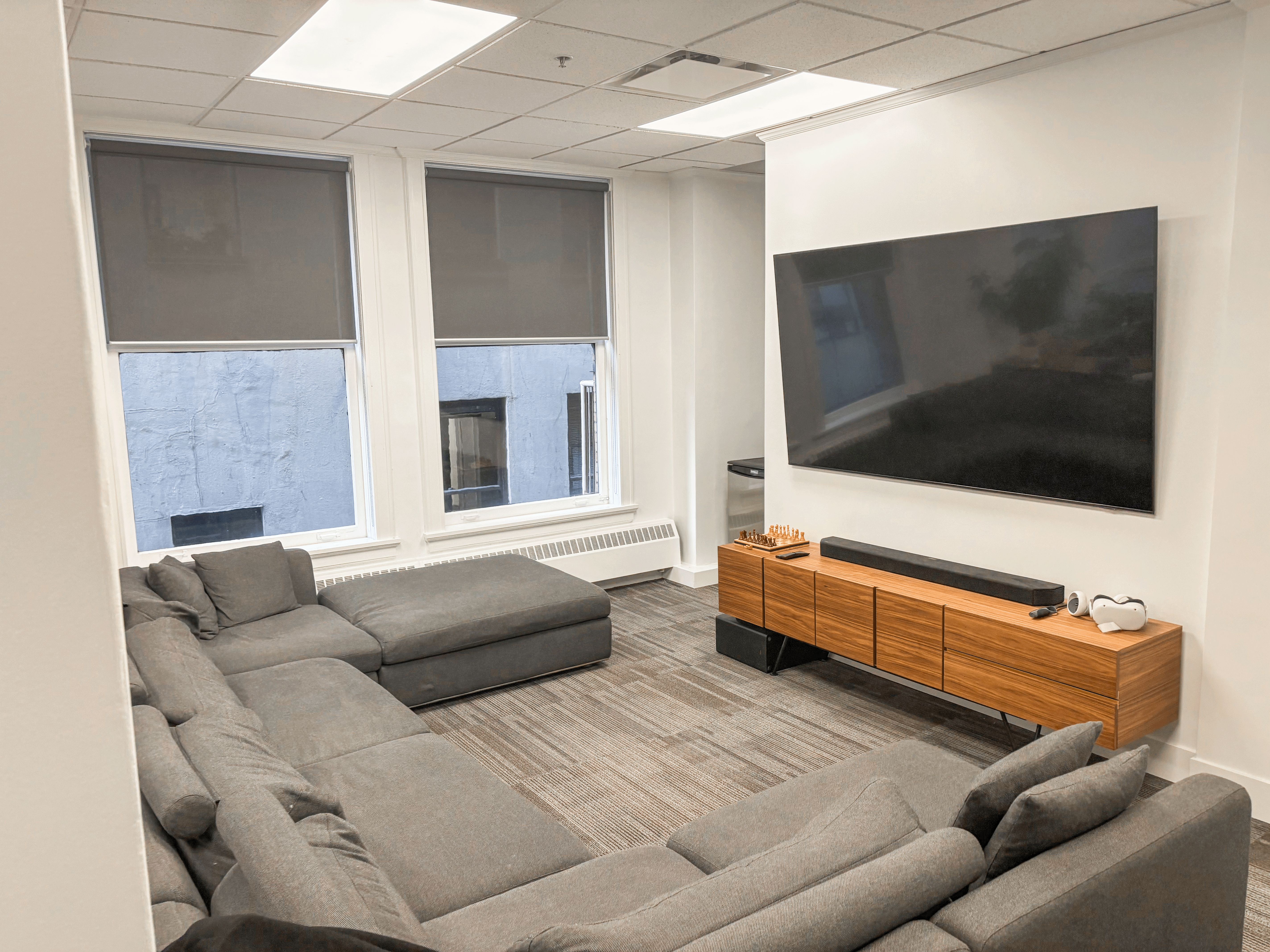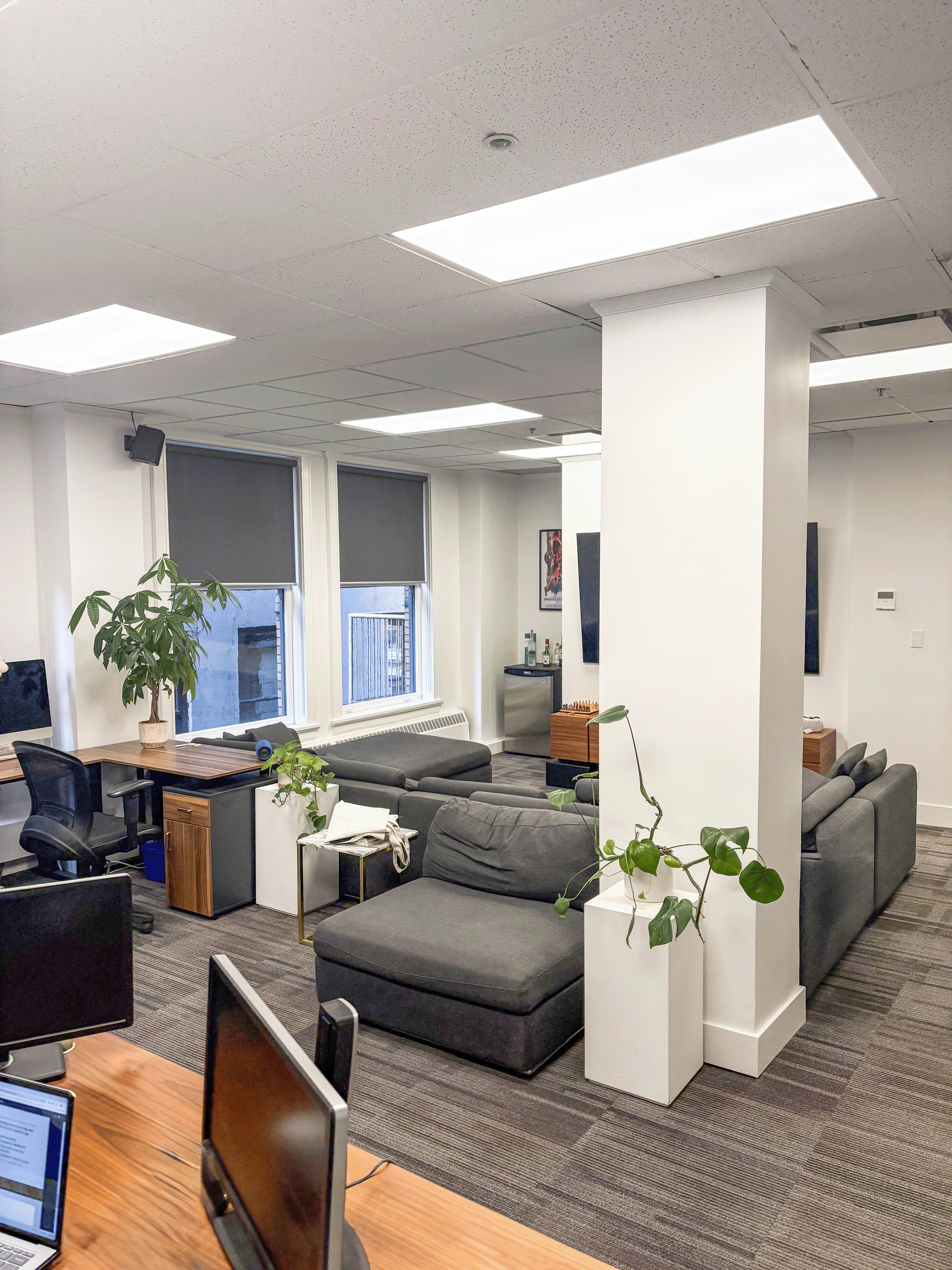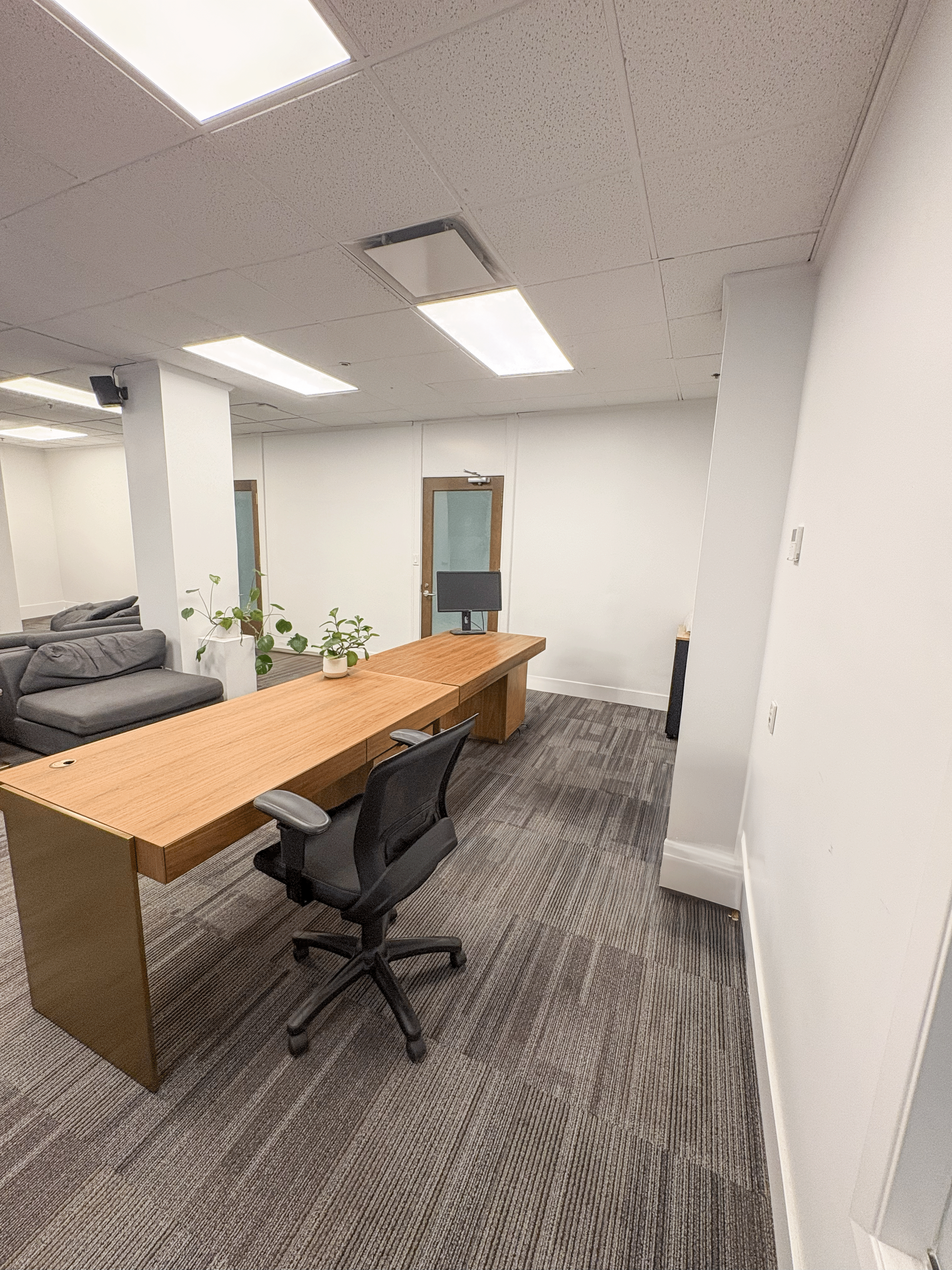 Suite 218 features open layout with one boardroom and an open plan work area totaling 1,226 SF. Equipped with a functional kitchenette area featuring quartz counter tops, spacious cabinets, sink and refrigerator.