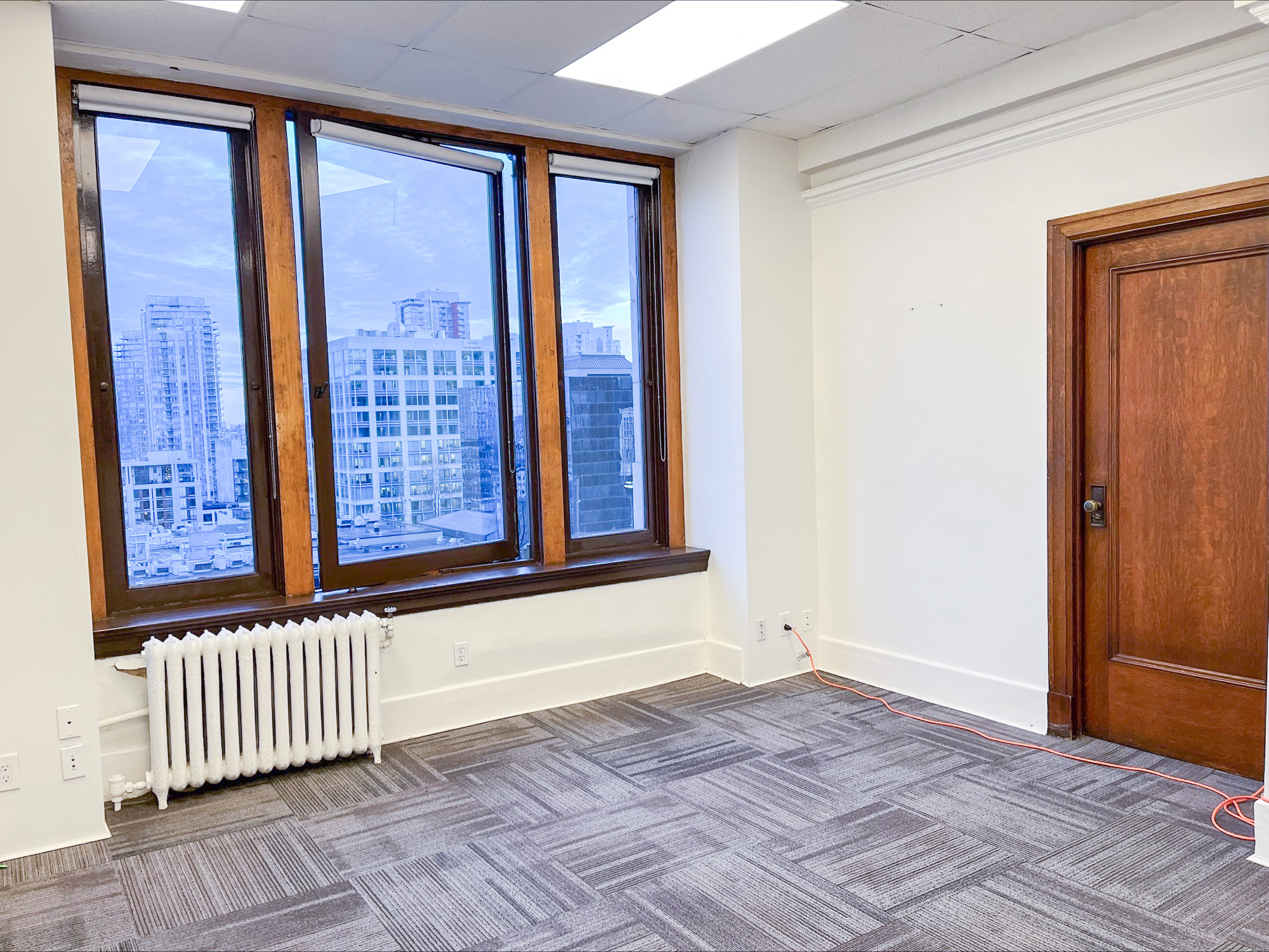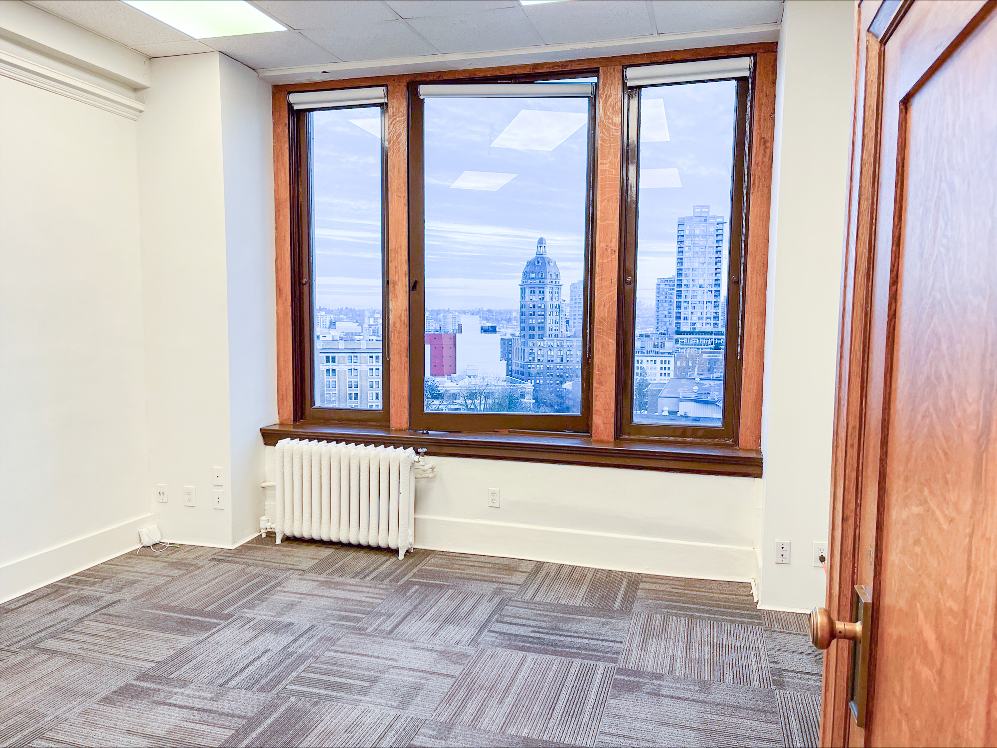 Suite 704 is a bright, top-floor boutique office with sweeping downtown views and classic heritage charm. This 305 sq.ft. workspace features oversized operable windows that frame the city skyline, filling the room with natural light throughout the day. Exposed ceilings, LED lighting, and original detailing create a unique blend of character and comfort—ideal for professionals, creatives, consultants, and anyone seeking a quiet elevated workspace in the heart of Downtown Vancouver.