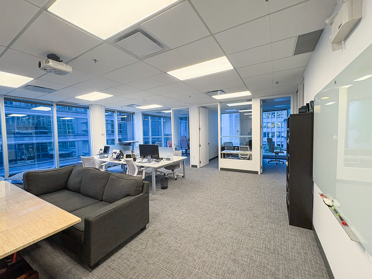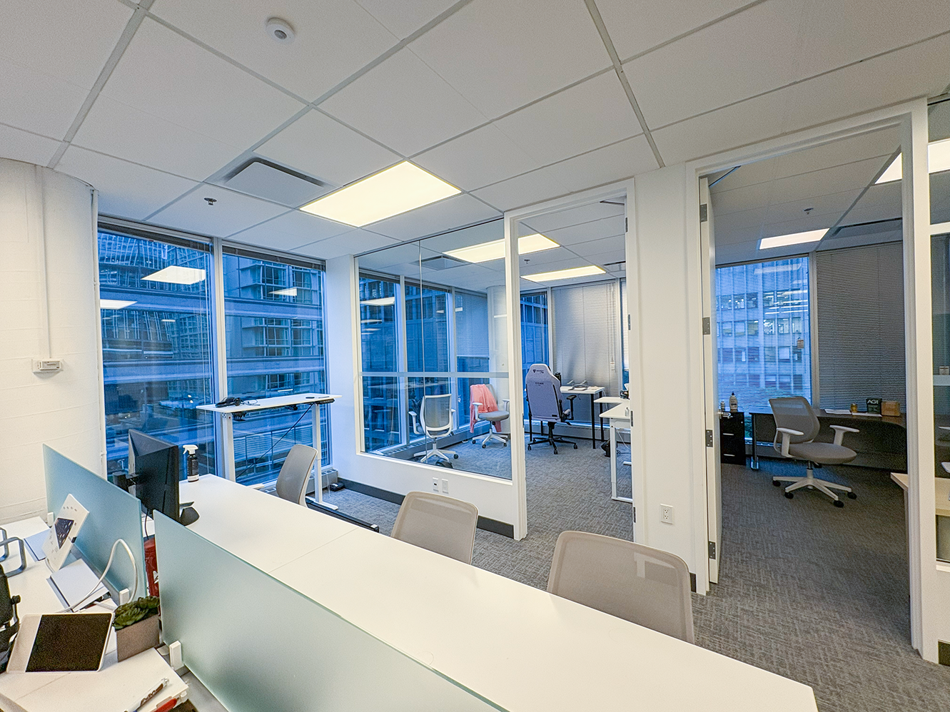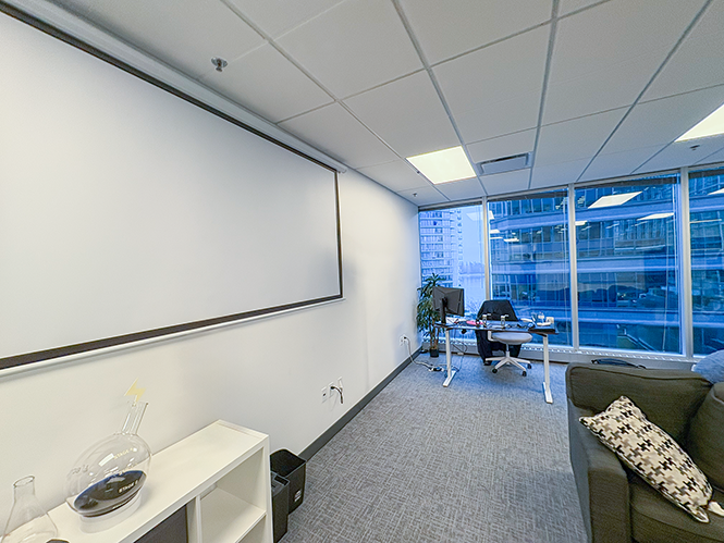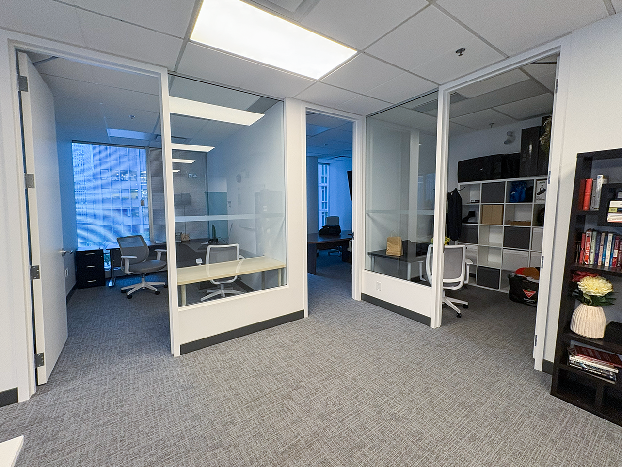 Suite 675 offers a turnkey, professionally built-out corner office in the heart of Vancouver’s Financial District, at the intersection of West Pender and Bute Streets. The suite features an efficient layout with two executive offices/boardrooms, two additional private offices, a kitchenette with stainless steel appliances, and an open-concept workspace, complemented by wrap-around floor-to-ceiling windows and selective water views toward Coal Harbour.