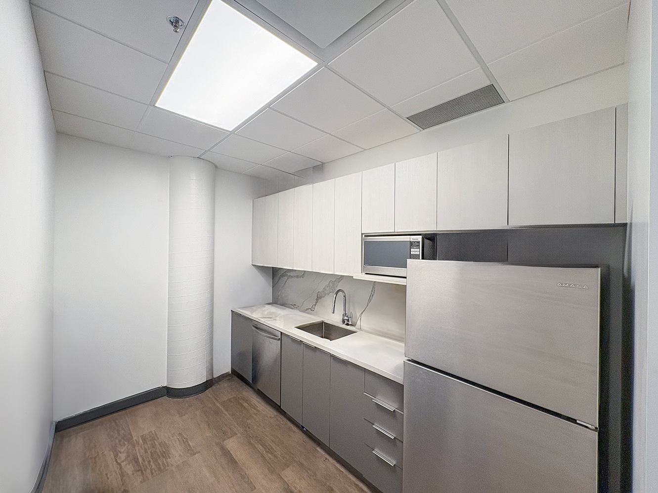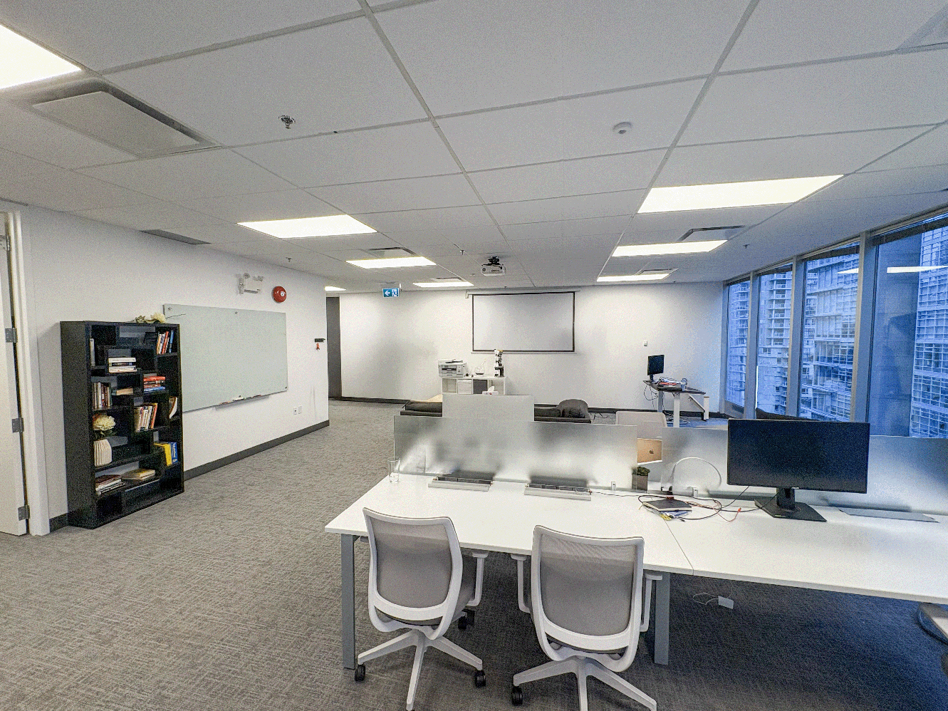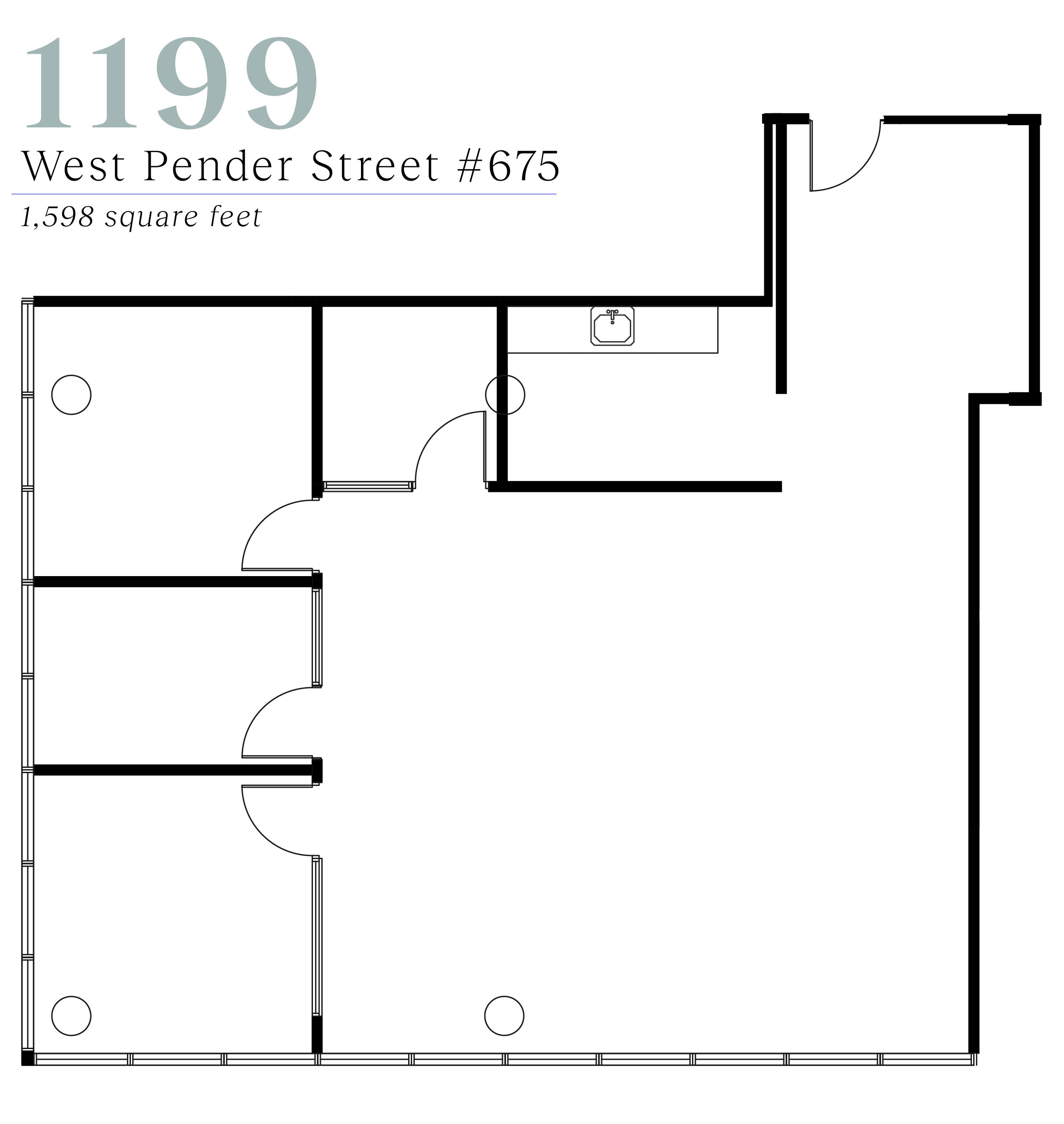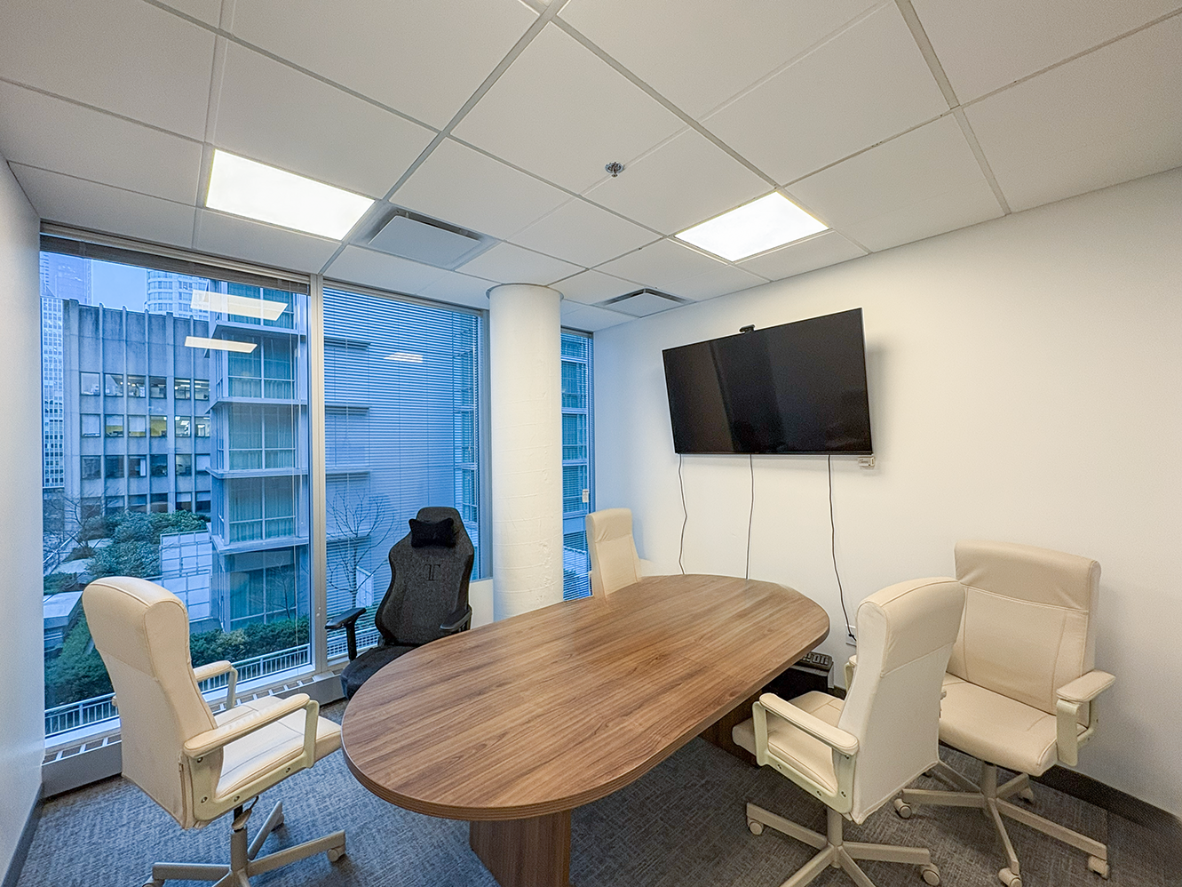 Suite 675 offers a turnkey, professionally built-out corner office in the heart of Vancouver’s Financial District, at the intersection of West Pender and Bute Streets. The suite features an efficient layout with two executive offices/boardrooms, two additional private offices, a kitchenette with stainless steel appliances, and an open-concept workspace, complemented by wrap-around floor-to-ceiling windows and selective water views toward Coal Harbour.