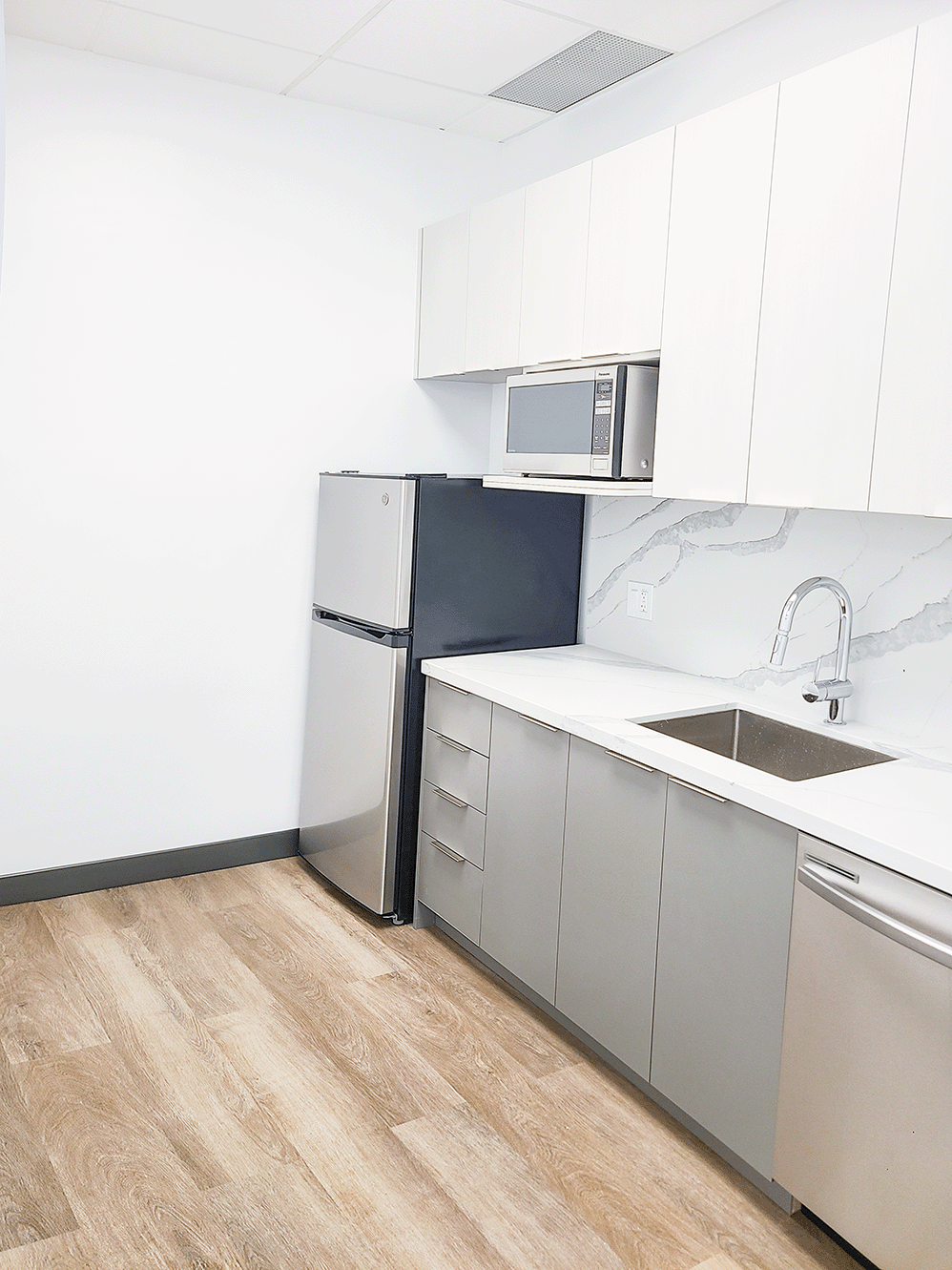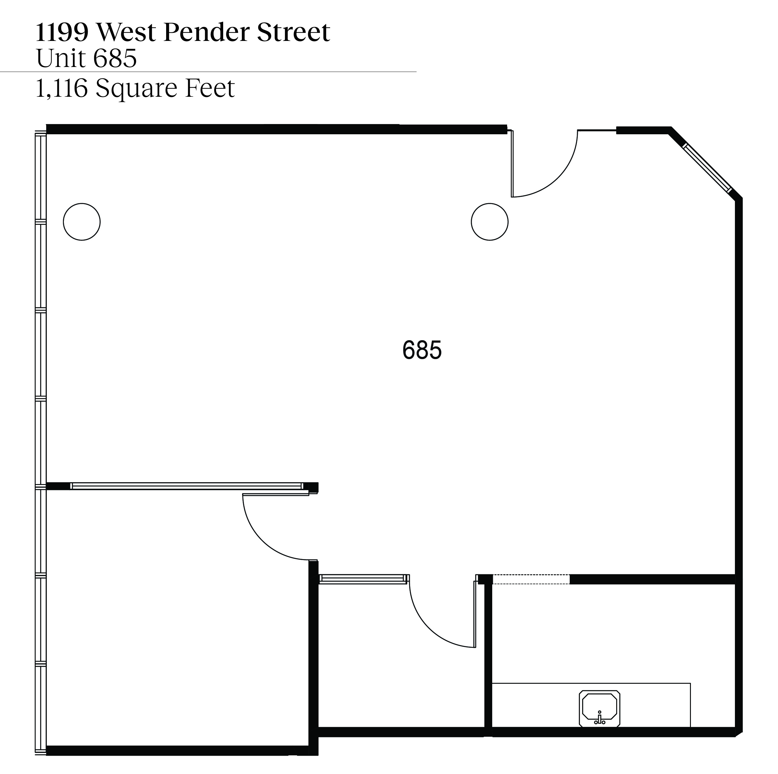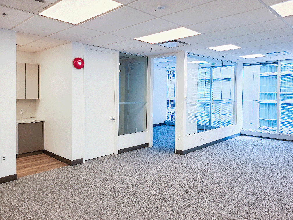 This 1,116 SF suite has an efficient layout with one private office or boardroom, a dedicated call room, and an open workspace area ideal for collaborative teams. Floor-to-ceiling windows provide excellent natural light, while a modern kitchenette with stainless steel appliances offers added convenience for staff.