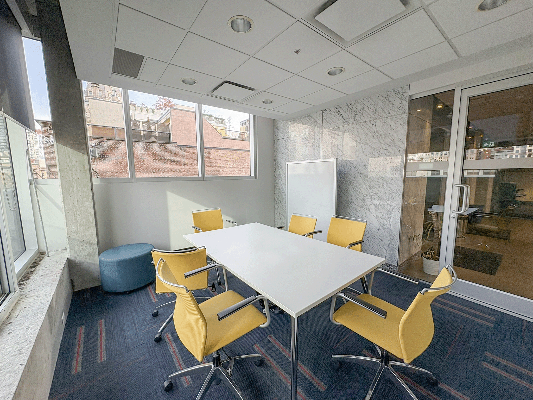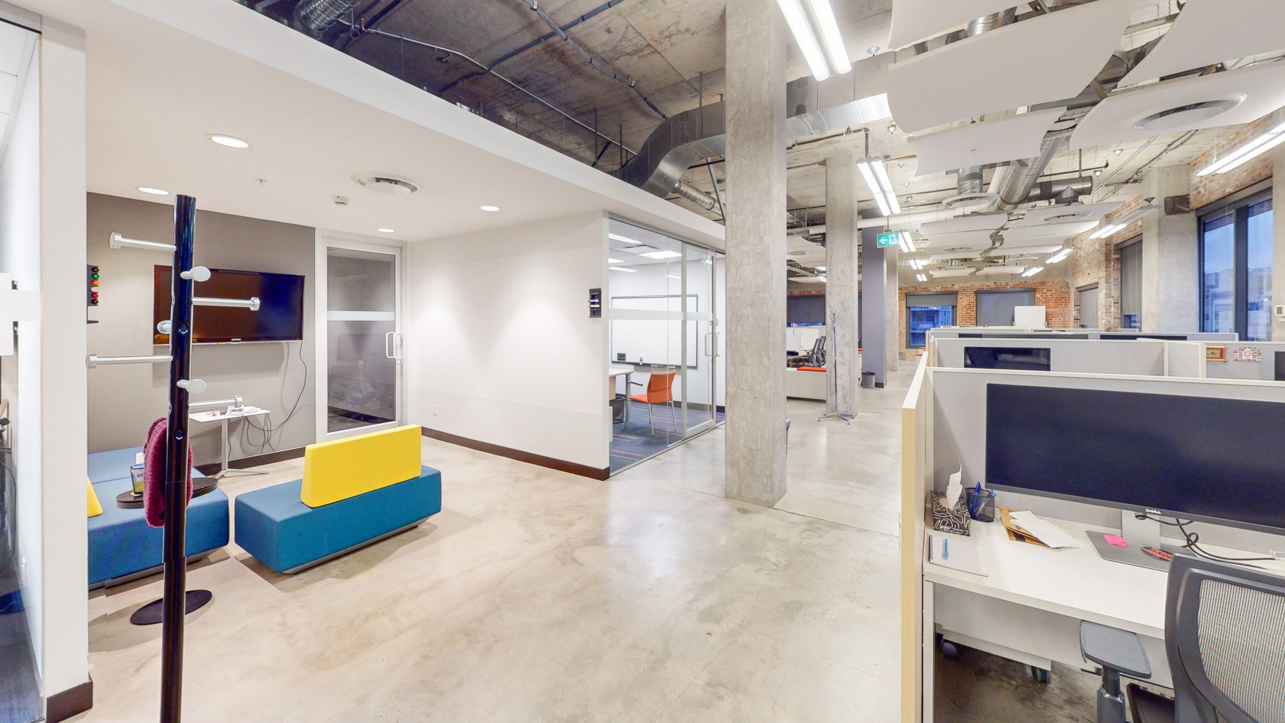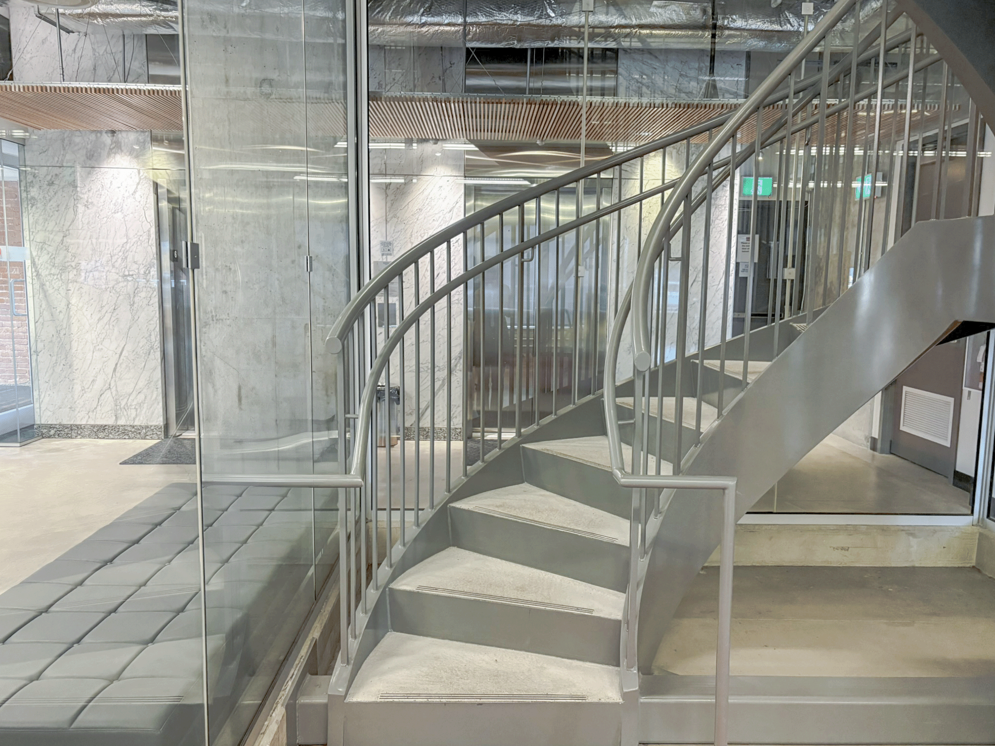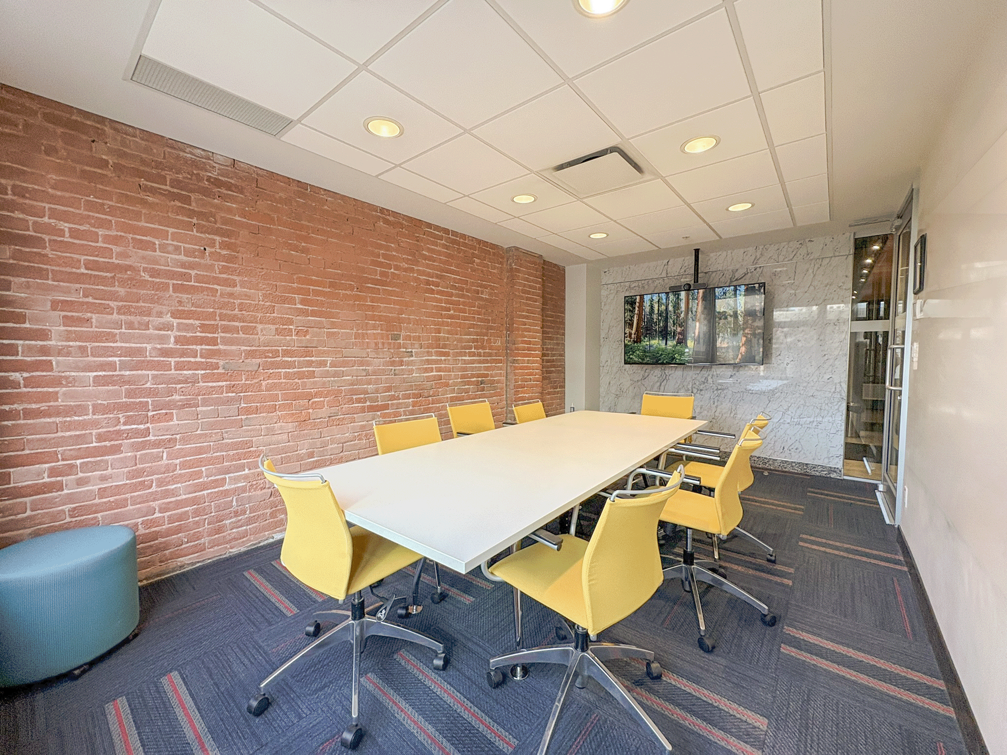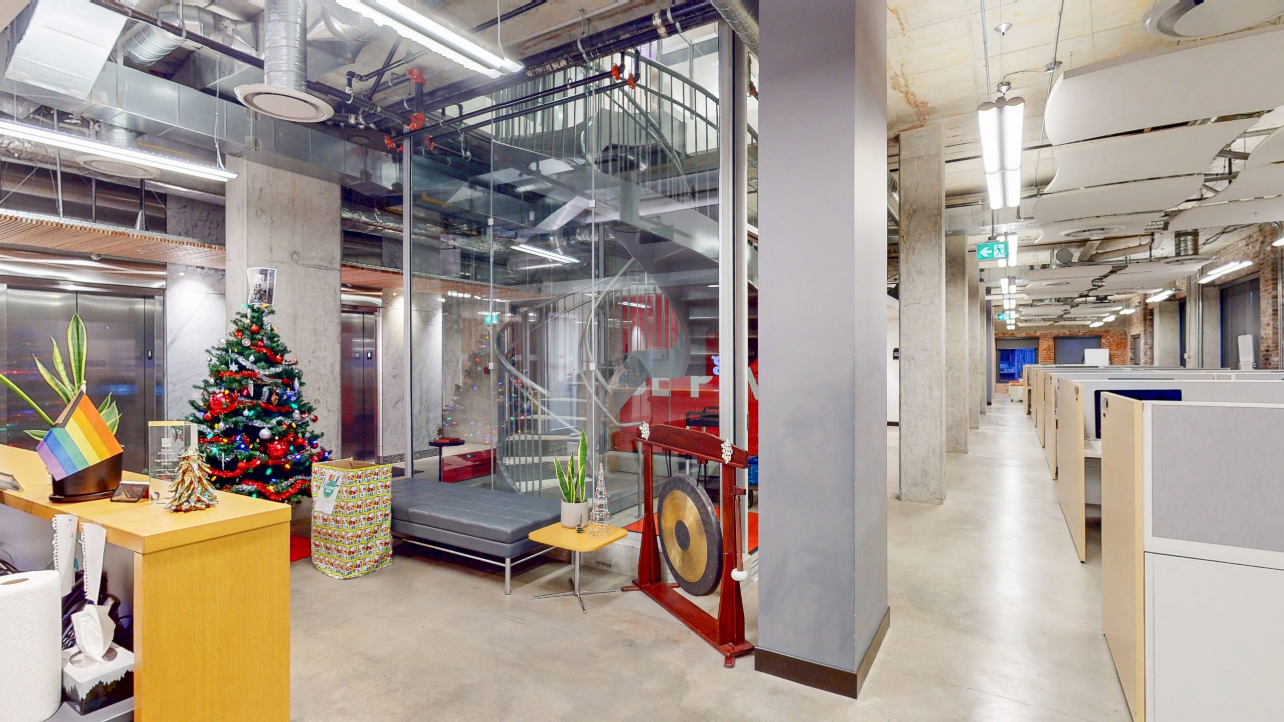This 9,723 SF brick-and-beam office seamlessly blends historic character with modern design, featuring exposed brick and polished concrete flooring, expansive floor-to-ceiling glazing, and a custom interior spiral staircase connecting both levels.